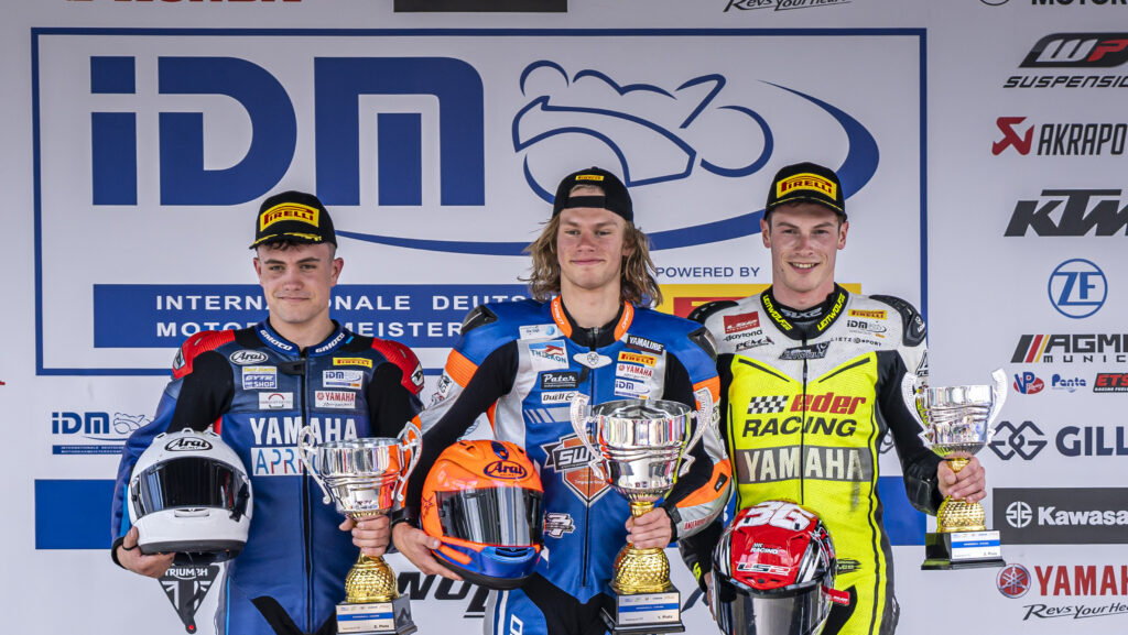 Melvin van der Voort (Team SWPN) schüttelte sich die lange Haare und grinste nach 15 Rennrunden mit 1.054 Sekunden Vorsprung: „Im zweitem Rennen tue ich exakt das Gleiche.“ Thomas Gradingers (Eder Racing) Start war nicht optimal und obwohl er auch nicht im Training ganz vorne zu finden war, gilt er doch als einer der klaren Titelfavoriten. Der Österreicher war nach dem Schlagabtausch mit Twan Smits (Team Apreco) froh, dass er die Yamaha ins Ziel bekommen hatte. „Ich habe hier und da ein paar Probleme gekriegt“, meinte der IDM-Champion von 2018 und anschließende Supersport-WM-Fahrer, der immer ans Limit geht und im vergangenen Jahr lange verletzt war. Das Podium war komplett in Yamaha-Hand.
