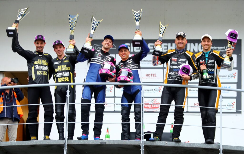 Markus Schlosser und Luca Schmidt (Team Schlosser/LCR Yamaha) starteten von der Pole Position ins Sprintrennen am Samstag und behielten auch nach dem Start die Führung fest in ihren Händen. Dahinter reihten sich Harry Payne/Kevin Rousseau (Steinhausen Racing / ARS Yamaha) sowie Tim Reeves, der eine Position gut machen konnte und Bennie Streuer/Kevin Kölsch hinter sich auf Rang vier versetzte.